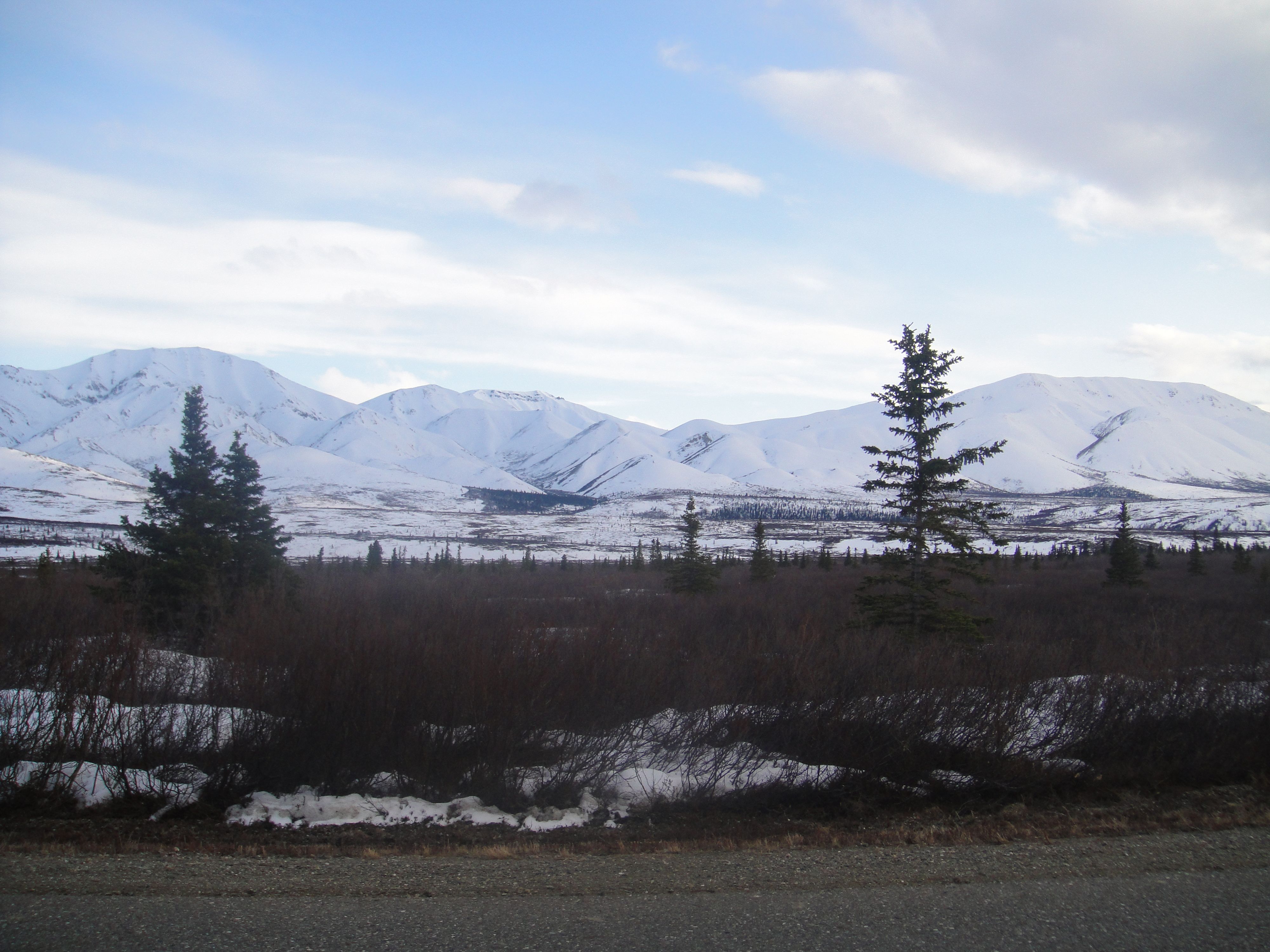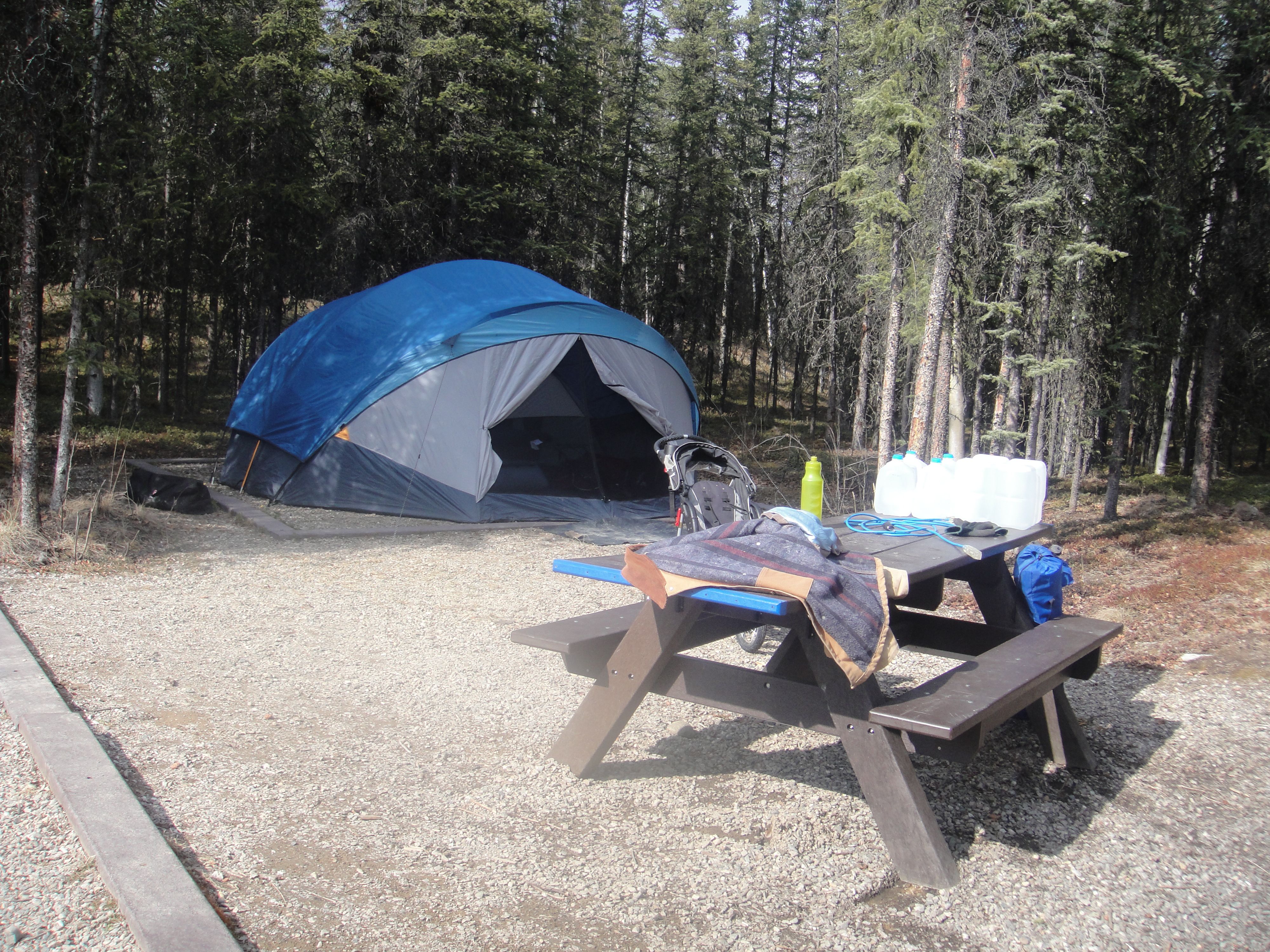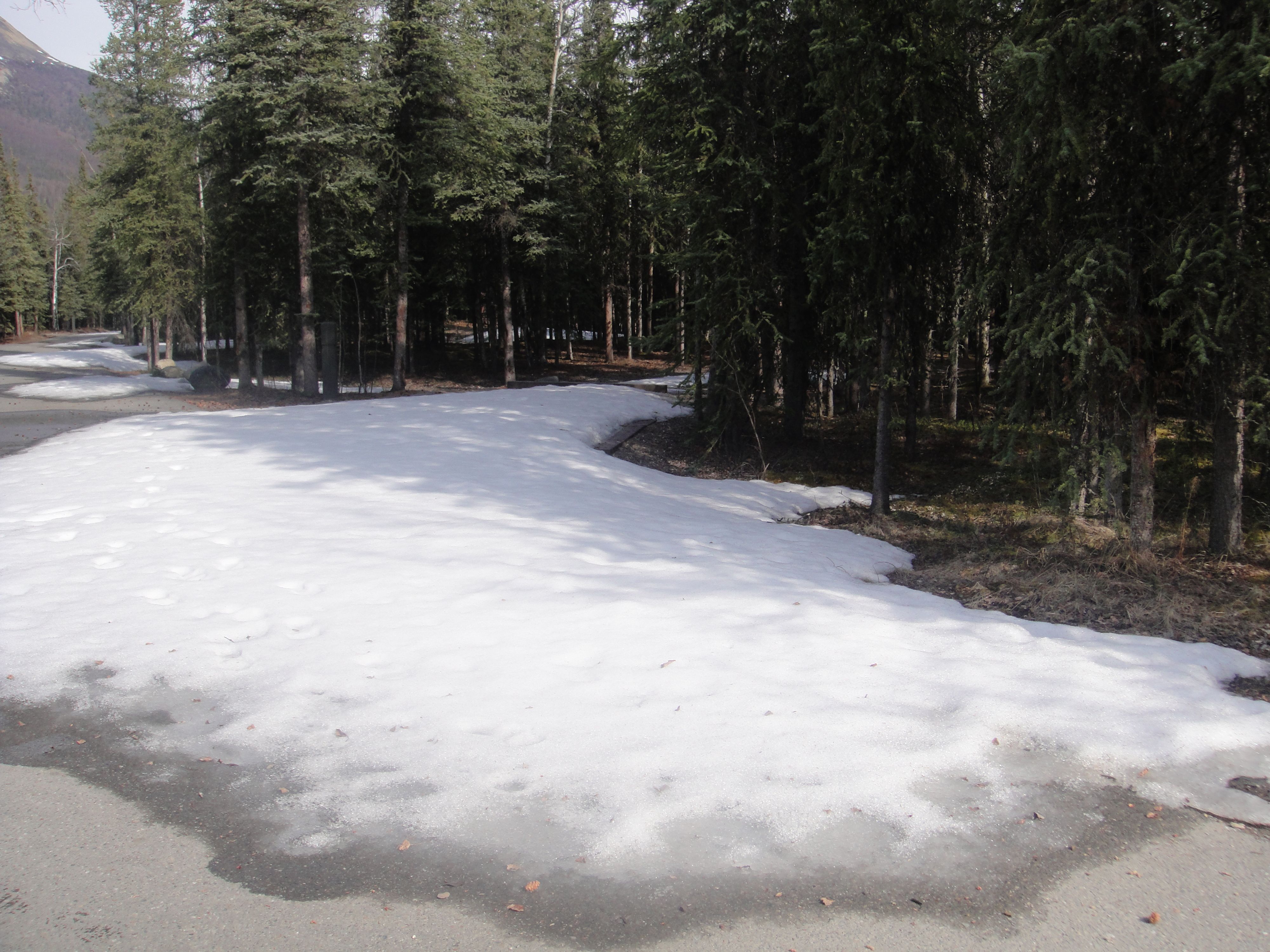 Matthew and I have a “bucket list” of things to do in Alaska before we leave. You know how it seems that you don’t do all those things that people who visit your city/state come to do? Well, that’s been us. We’ve been here for nearly five years and we only have a few weeks left, so it was time to start actively checking things off of our list! First was camping in Denali. Denali National Park is open year-round, but once Tourist Season begins the rules change, so we wanted to visit before that (read: while things are free). One campground is open for the winter, so we drove down after church on Sunday and picked a spot. The drive took about three hours (we were pulling a trailer, so it was a little slower than normal). Levi didn’t sleep for one minute of it! Funny, because he barely makes it home after church most weeks… While the campground is open, none of the “amenities” are available – no mercantile, flushing toilets, or running water spigots. Oh well, at least we came prepared! The afternoon was sunny and fairly warm, though there were still spots of snow in the shade. This was all the snow at our particular site…