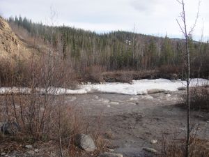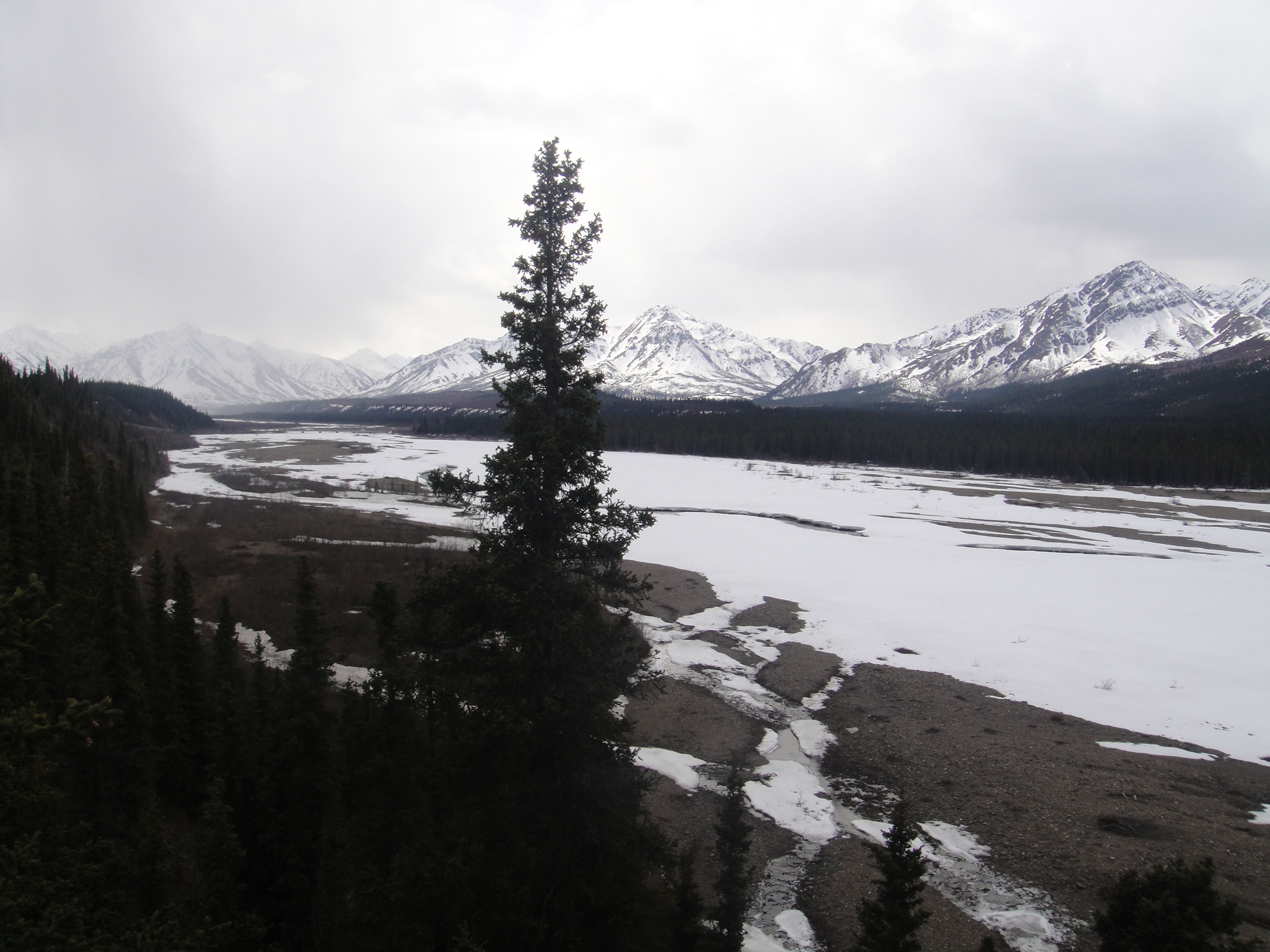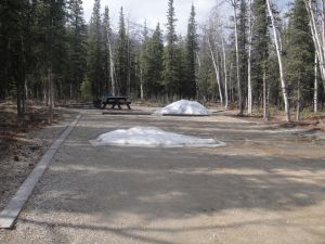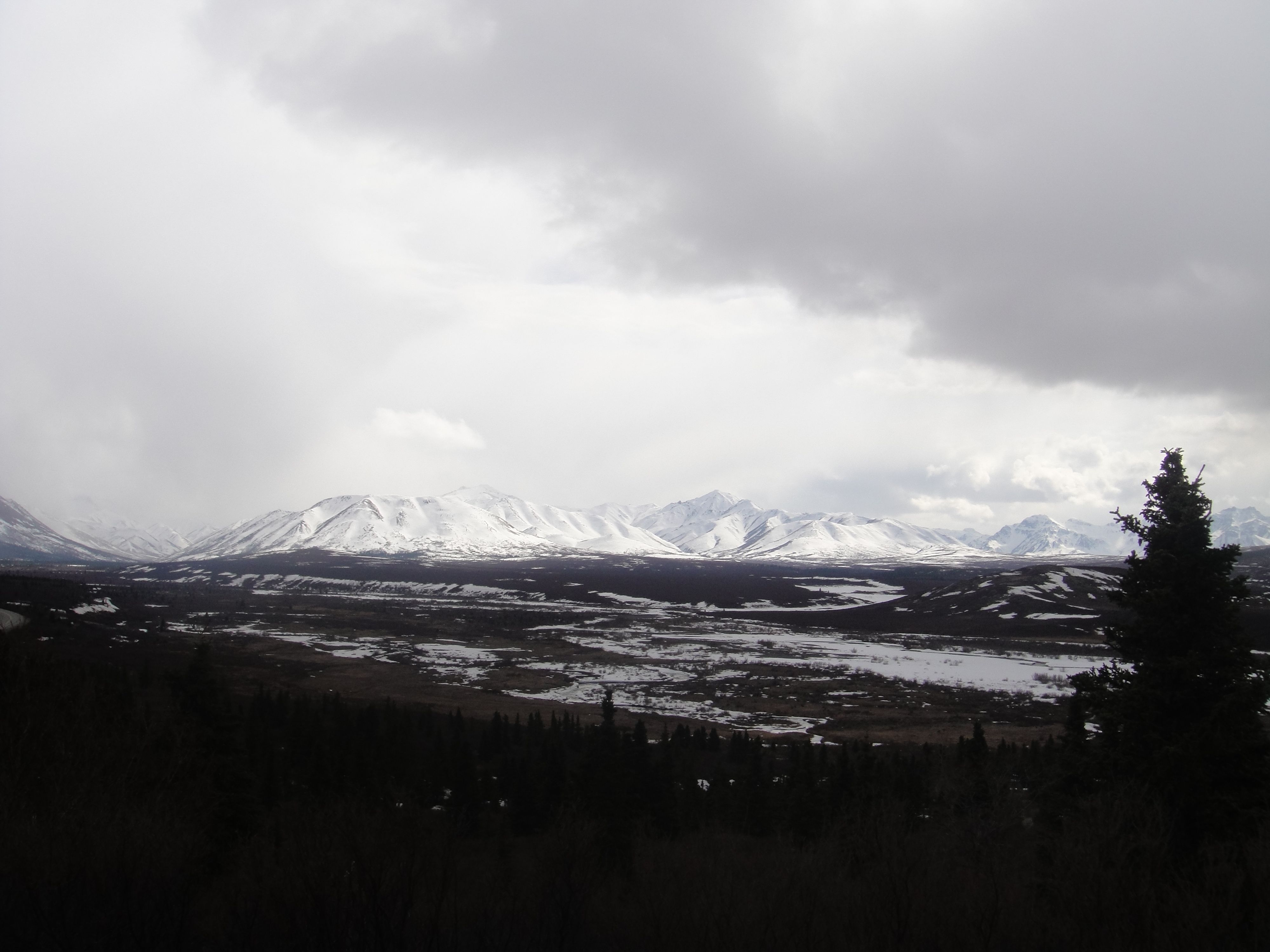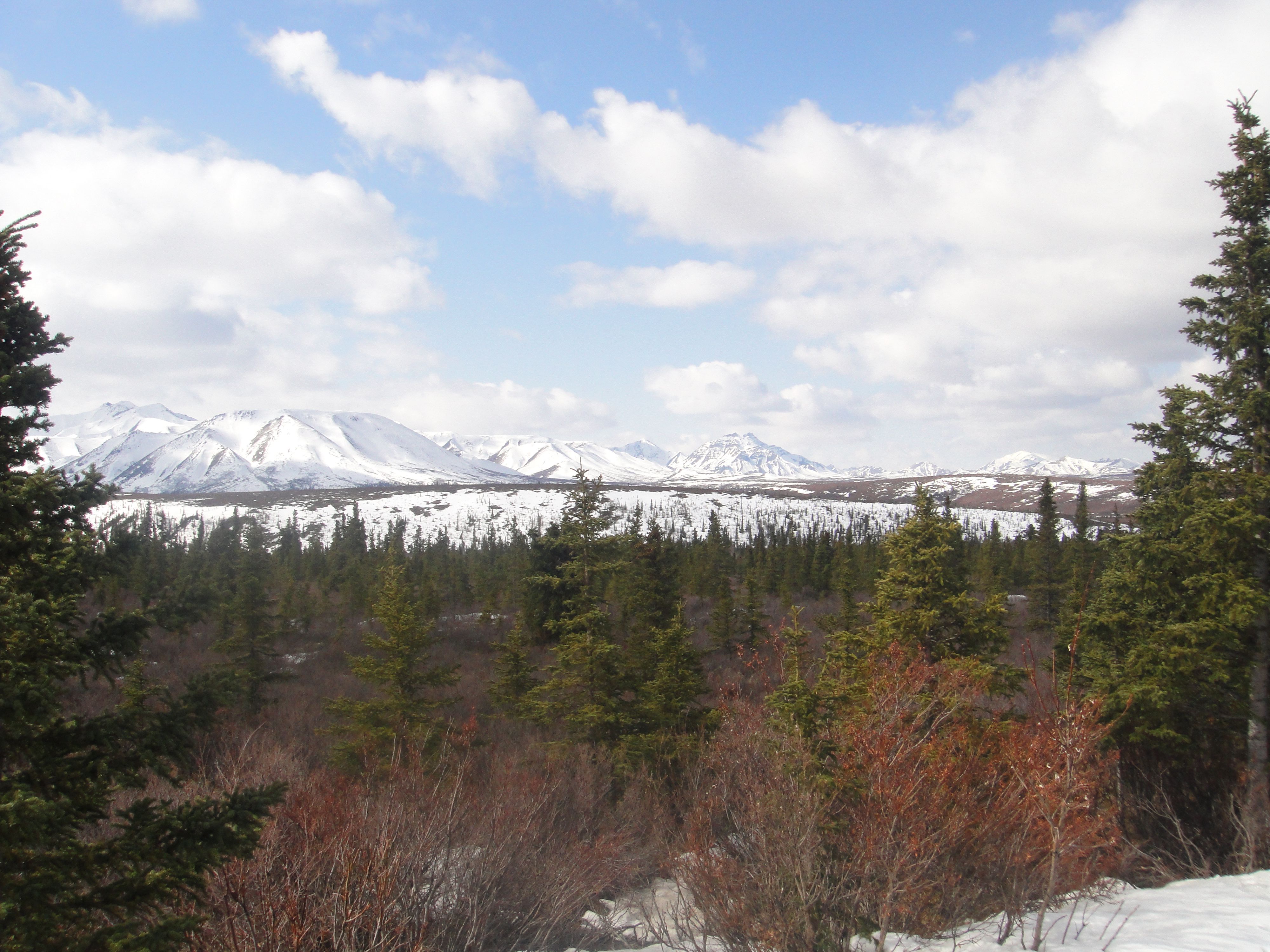 Matthew and I have a “bucket list” of things to do in Alaska before we leave. You know how it seems that you don’t do all those things that people who visit your city/state come to do? Well, that’s been us. We’ve been here for nearly five years and we only have a few weeks left, so it was time to start actively checking things off of our list! First was camping in Denali. Denali National Park is open year-round, but once Tourist Season begins the rules change, so we wanted to visit before that (read: while things are free). One campground is open for the winter, so we drove down after church on Sunday and picked a spot. The drive took about three hours (we were pulling a trailer, so it was a little slower than normal). Levi didn’t sleep for one minute of it! Funny, because he barely makes it home after church most weeks… While the campground is open, none of the “amenities” are available – no mercantile, flushing toilets, or running water spigots. Oh well, at least we came prepared! The afternoon was sunny and fairly warm, though there were still spots of snow in the shade. This was all the snow at our particular site…