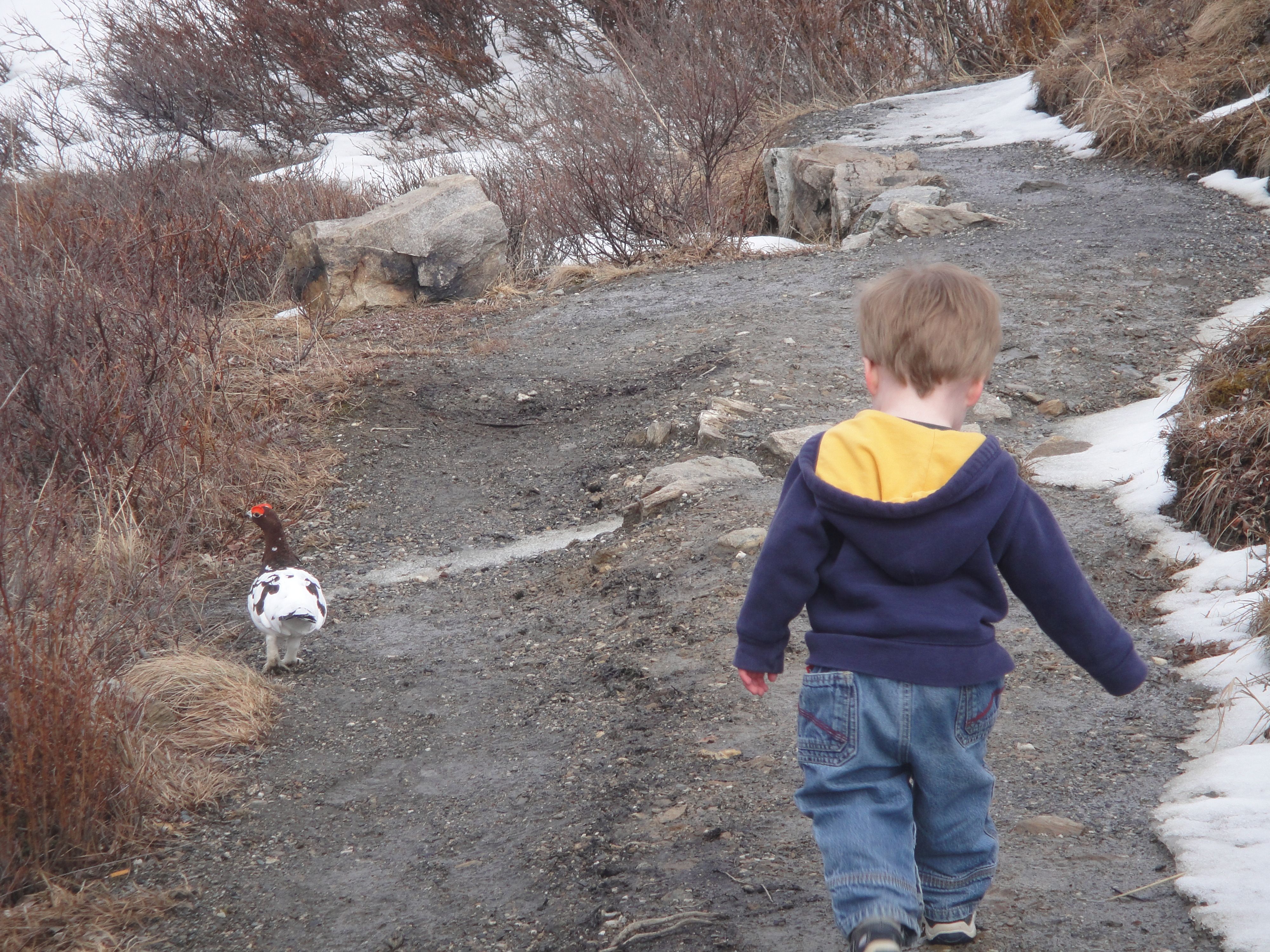 We found another trail and Levi found a friend along the way: our state bird, the Willow Ptarmigan.