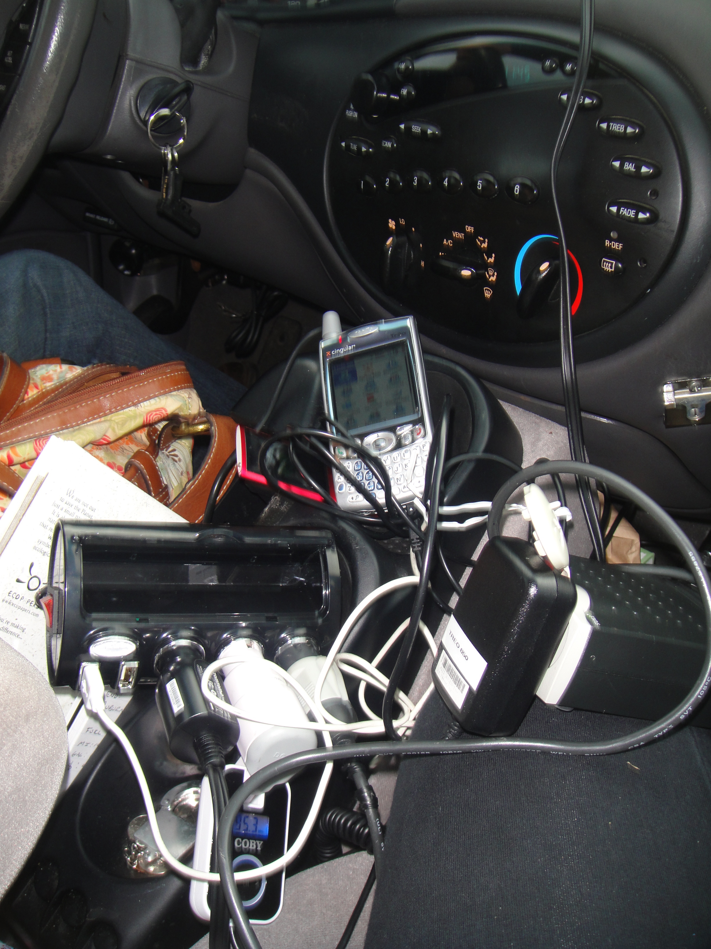 iPod, iPod to radio connector, GPS, phone...one big, necessary mess