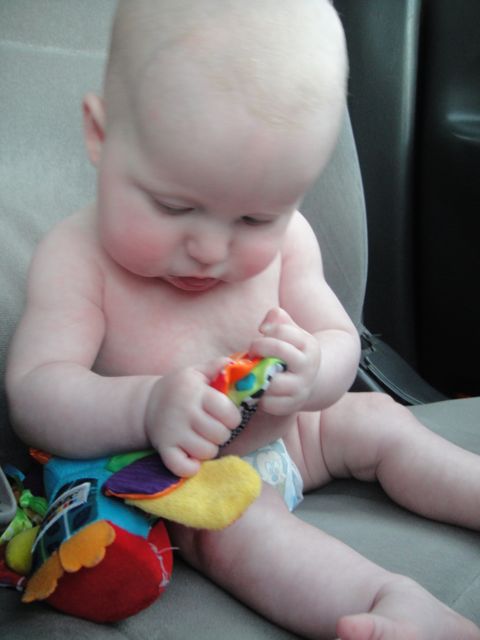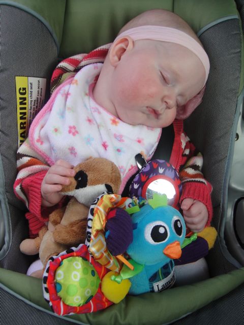 Amelia and her toys...she is partial to her meerkat and his nose.