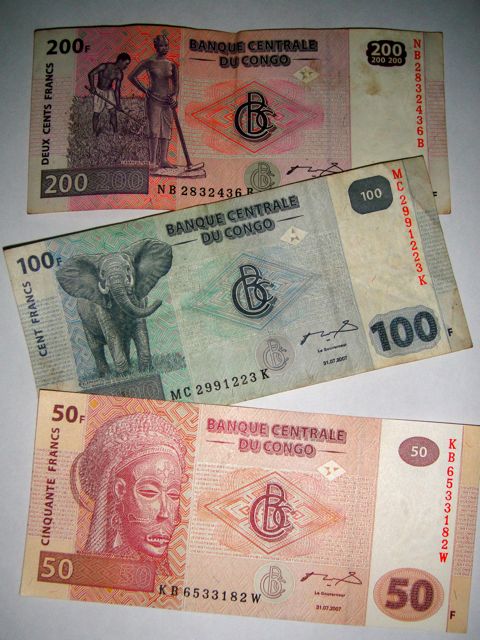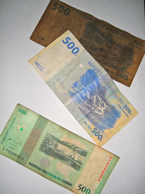 So, today’s post is a bit about money.  The official currency here in DR Congo is the Congolese Franc.  It comes in 10, 20, 50, 100, 200, and 500 bills.  I’ve never seen a 10 or 20 and 50s are fairly rare.
