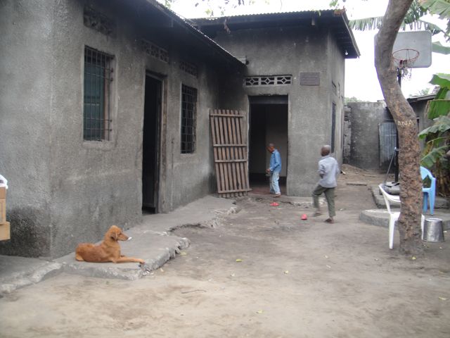The meal prep area entrance on the left, and the sleeping quarters entrance on the right. The courtyard is entirely visible, and the bathroom are on the right side of the picture.