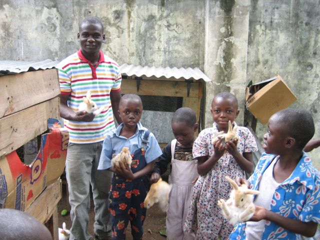Orelick, Lee and Becky’s older adopted son, shows the younger kids his baby bunnies