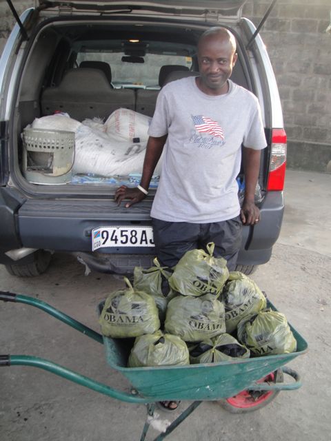 Blackened wood is used to cook foods by most Congolese, using a babula (see in the back of the SUV). I was simply amused at the bags. They love Obama here.