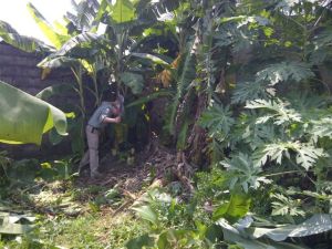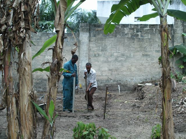 The site started out as a sloped back yard with a 20 year old compost pile and a stand of (non-productive) banana trees. Shortly before Nick headed to Canada, we took the trees out and got the sentenals started on leveling the build site