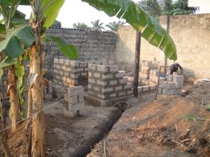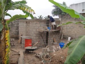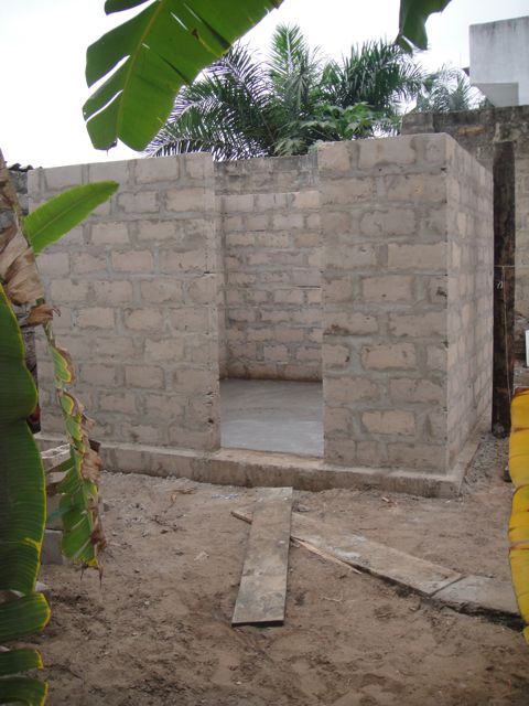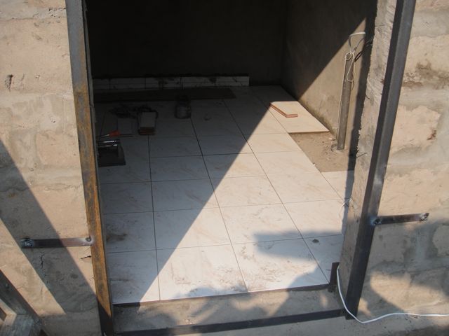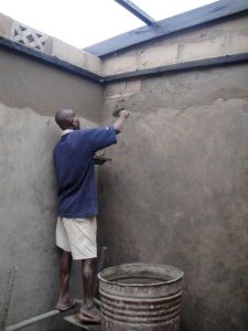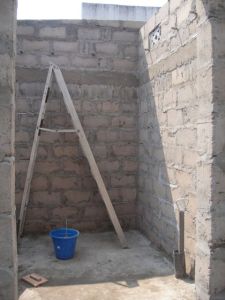 The entire building was coated with a layer of mortar, locally called “cripsage”. This helps protect the weak blocks from damage, and provides a paintable surface. I wanted to keep out as much dirt as possible, so the only ventilation blocks went above the ceiling line.