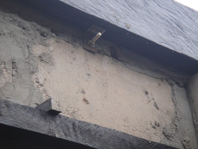 After the lintel, we only had a couple rows of block to finish, so I had Leopold set angle iron brackets into the wall. These I would use later to attach the ceiling supports. Once the wall was at full height, I set the roof beams on the supporting walls, and used expansion bolts with angle iron brackets to tie them in place. The local method is to spike them in with rebar, or tie them down with rebar tie wire – I found the bolts far more simple and quite a bit stronger. The beams are treated with creosote (slathered on by hand) and the rest of the wood got a healthy rubbing of used motor oil.