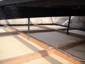 Working with the wood was a real challenge – it is rain forest fresh and crazily warped. Even so, I was able to get a ceiling grid in and stepped it up a notch by tying the middle of the grid to the roof beams with more angle iron. I am hoping this keeps the ceiling from sagging over the years.