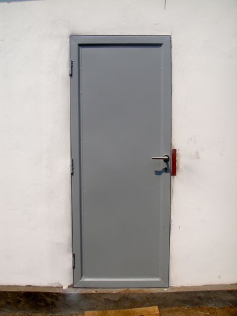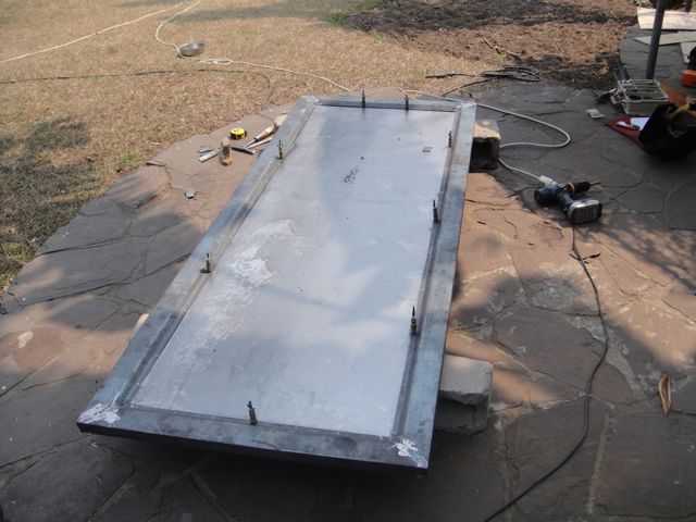 I first built an angle iron frame that I expansion bolted to building – the bolts shooting through anchor straps over the mortar joints. I also put two bolts straight down into the floor and two into the concrete lintel (not shown here). The way I designed the frame created a low threshold and allowed the lower angle section to be almost completely covered by the tile floor. This done, I built the door frame and door to fit. The door is built out of formed sheet metal called “bottle profile” that allows sheet metal to slip inside the hollow frame. The stuff is a pain to weld because I don’t have mig or tig here, and the lowest arc settings just want to blow holes. I ended up stick welding it with a piece of scrap metal in one hand to use as a filler. Crude, but effective. I chose rivets to secure the metal panel as an alternative to tack welds – not just for strength but also to achieve the bank vault/dungeon look. Once the door hinges were welded in the frame, I (with help from Nestor), got the whole shebang level and plumb, and stitched it into the iron frame on the doorway. I am pretty sure you could pull the trailer hitch off of a truck with this thing.