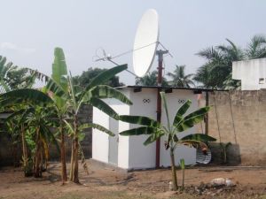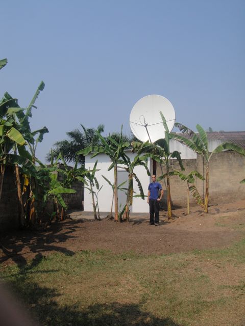Back on site, David Francis (with some help from Rod) cleaned and waxed the dish (it seriously had fungi growing on it) while I welded the upper pole section into place (once again, with some help from Rod). The mount bracket in place, it was all-hands to lift the dish into place (thanks Manny!). Two and half hours from dish-on-site to dish-in-place! Not bad! I spent the next couple hours pulling cable with Pierre, while Avuta got the dish connected and Nick started the physical set up of the servers. By shortly after three, the VSAT was live, and we simply needed to plug in. I think I left around 5pm as Pierre and Avuta were finishing up… and we had internet back on line by 5:30!