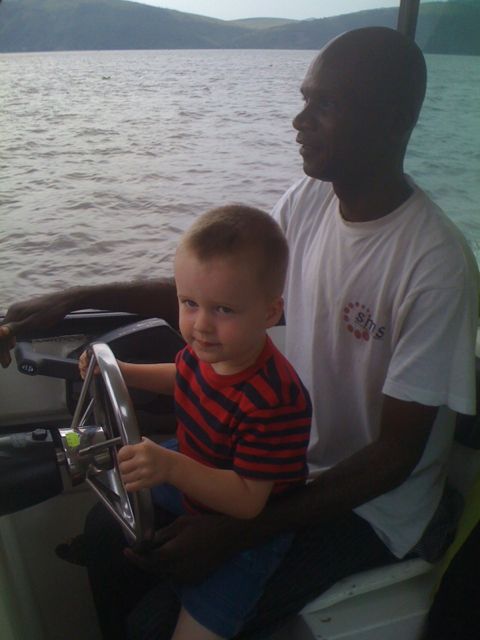 My little dude driving a boat at 35mph on the CONGO RIVER