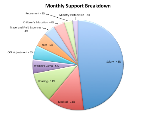 This pie graph is MAF’s breakdown of the monthly support goal. It is an average of all of the worldwide programs, so the actual numbers may vary.