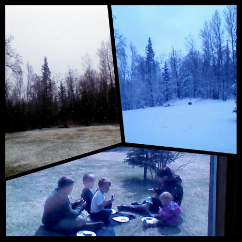 This photo stitch represents three of our four days in Palmer, the bottom one taken just a second ago of our and our hosts’ kiddos enjoying a picnic. Perhaps spring is finally here to stay in Alaska…