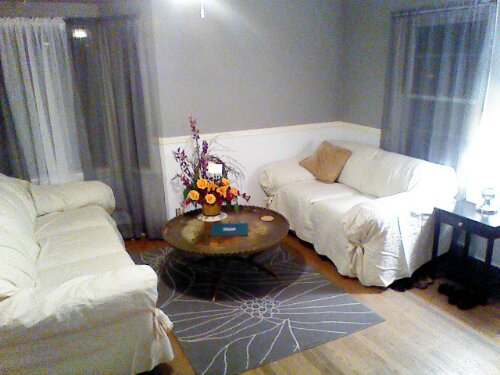 Couches from the thrift store, curtains 75% off at an amazing sale, side table one of the rare pieces we kept from life in Alaska, lamp from my (Lisa’s) mom as a house warming present, brass coffee table a wedding gift from Matthew’s grandfather, brought back from India where he was a missionary in the 1950’s-ish, and rug from craigslist. The book on the table is our summer’s adventures in pictures – we took a photo with EACH family we stayed with, plus a few other highlights. Amazing blessings that make up our living room.