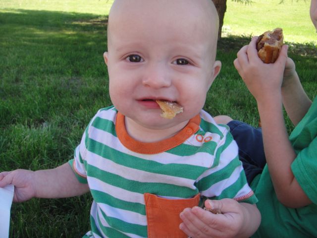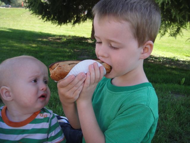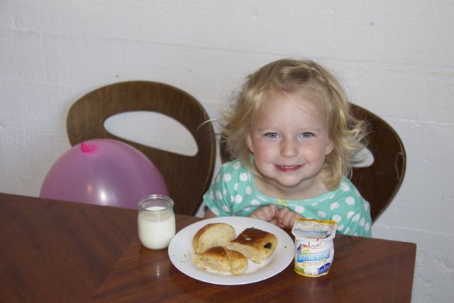 Birthday girl pre-breakfast (there were sausages and eggs later) – sharing some French pastries.