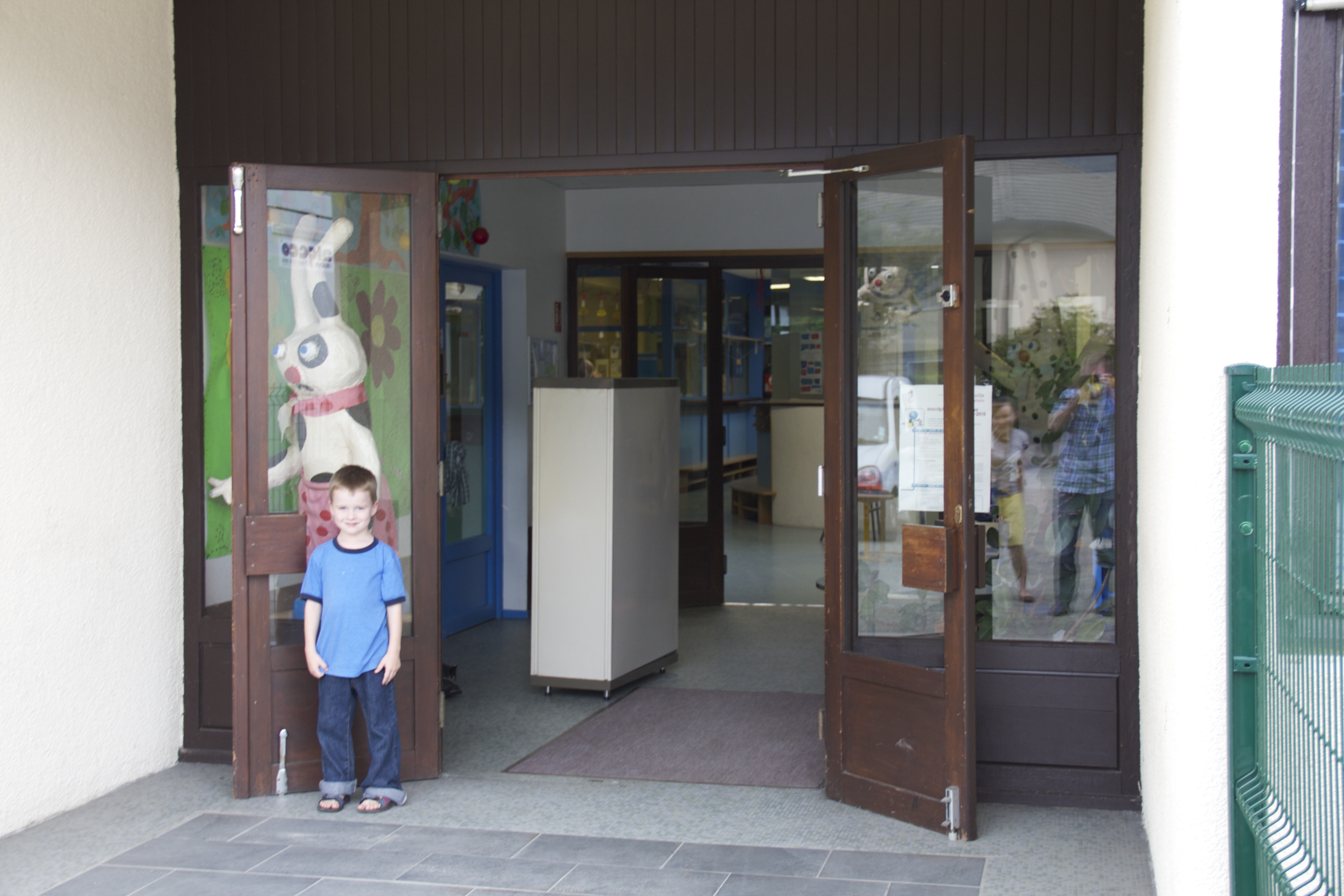 Levi in front of his school on our first visit there. Amelia’s classroom is the blue door just inside.