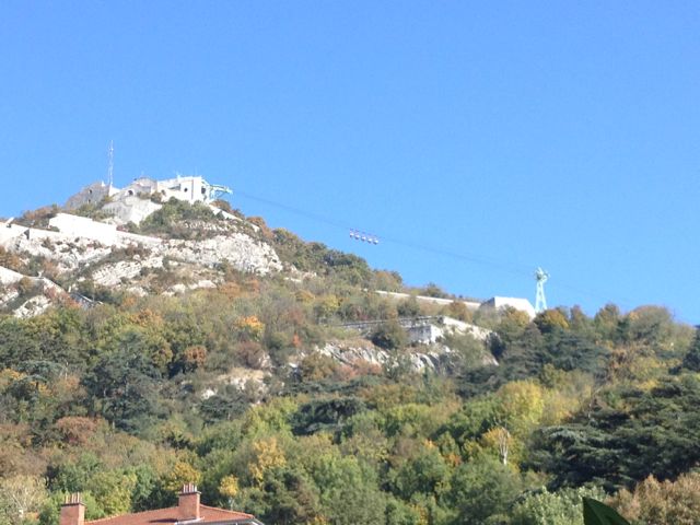 From Grenoble, looking up at the fort. The “bubbles” are basically a cable car – we hope to ride these in the future!